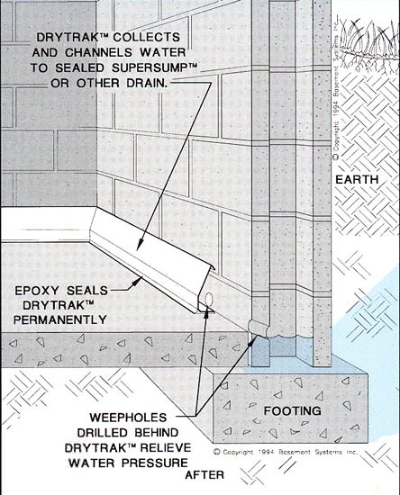 We address this challenge by installing our DryTrak® Drain Pipe System. This is a baseboard drain that is permanently epoxied above the floor (and above the mud sitting below the floor) -- with no jackhammering.