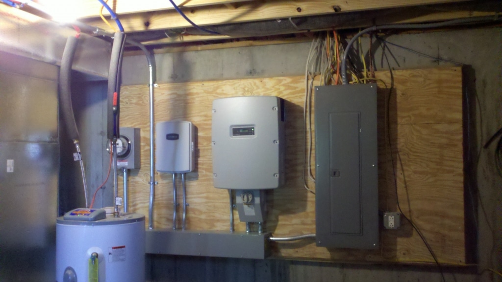 This 4,500 W (4.5 kW) grid-connected solar electric system was installed as a roof-mounted array of twenty (20) SunPower 225W solar modules oriented South on the roof of the Customer’s house. The array is arranged as five rows of four modules, as illustrated in the accompanying schematic.The modules are mounted at the same pitch as the client’s roof (30.3°) using a UniRac SunFrame racking system. The array layout is designed to maximize system size and future expansion options, while allowing only minimal losses due to shading and ensuring the system is aesthetically pleasing and well-integrated with the house. The system is configured electrically as two (2) DC circuits (strings) of ten (10) series connected modules providing input through one (1) DC disconnect switch to one (1) SunPower 5000m, 5.0kW inverter. This inverter provides grid-synchronous AC output and interfaces to the electric utility through a dedicated circuit breaker in the Customer’s main service panel, as existing infrastructure allows. System power production (kW) and cumulative energy (kWh) monitoring is provided by a SunPower Data Logger and Online Monitoring System, as well as by a digital display on the inverter and an electromechanical meter.As designed, this system should generate 5,222 kWh per year, for an average of 14.3 kWh/day, where daily energy production is both weather and seasonally dependent. This energy production is equivalent to 29% of the customer’s expected new home electrical usage, and corresponds to a CO2 (greenhouse gas) emissions savings of 6,784 lb per year.