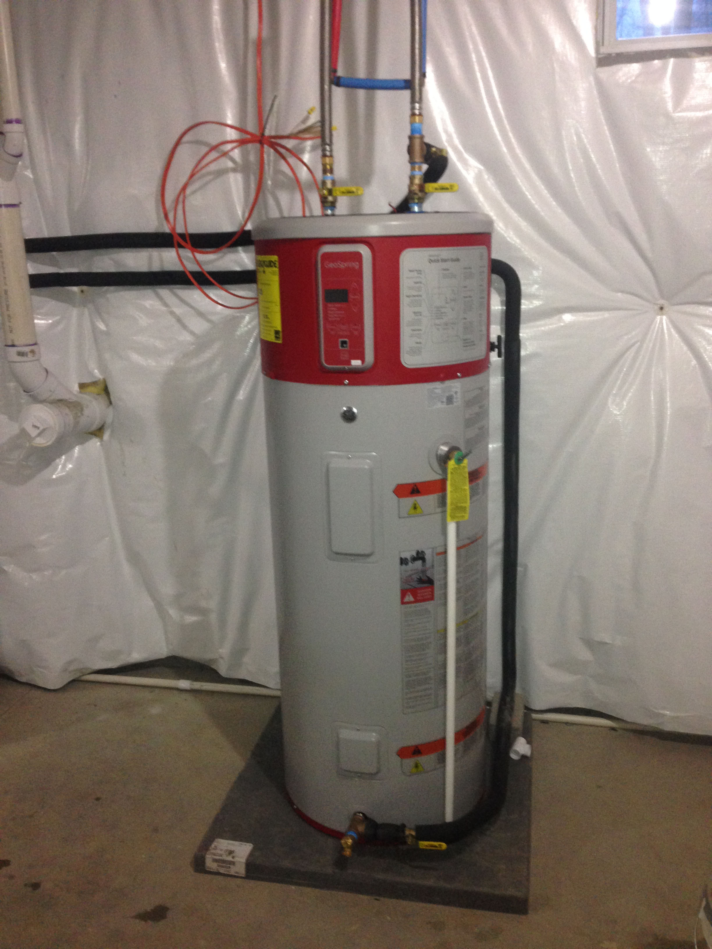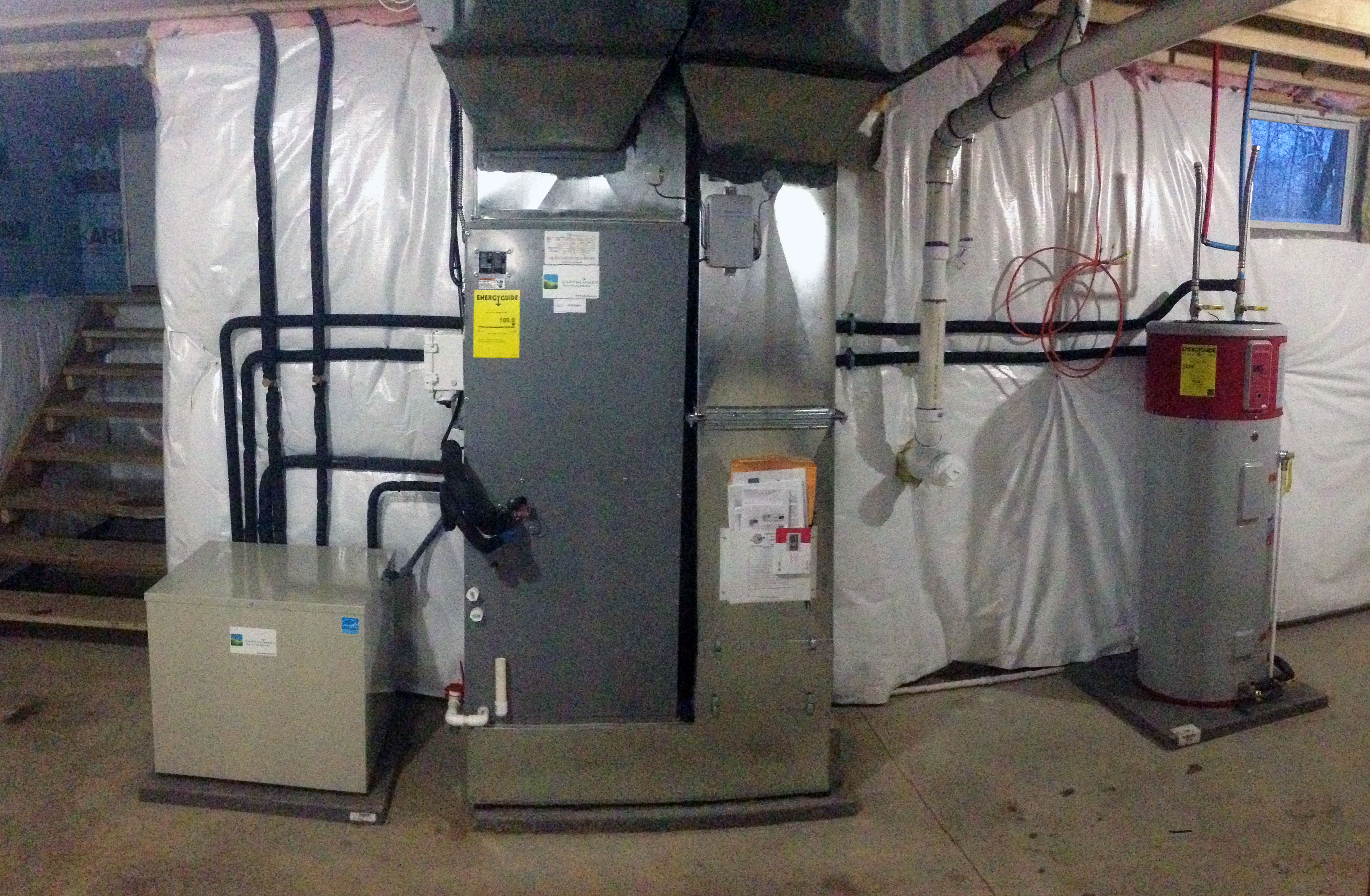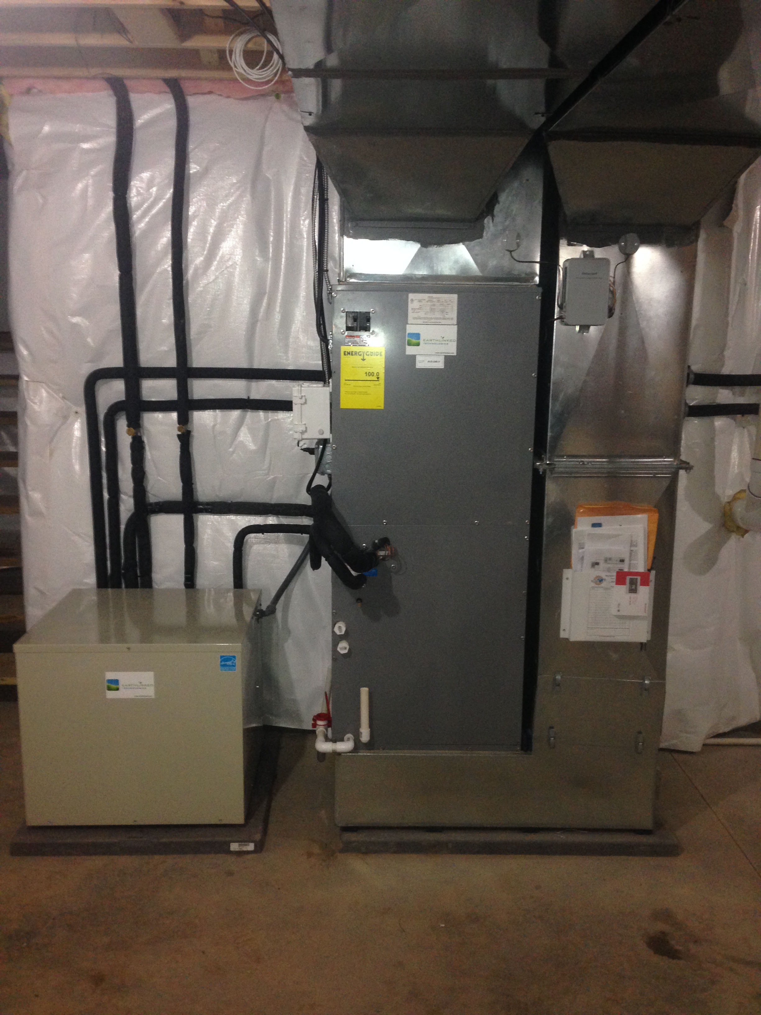 On the inside of the home, a 4-ton direct expansion compressor unit and refrigerant-to-air air handler served the forced air heat and air conditioning of the entire home, including the basement. This compressor unit also was ordered with domestic water heating capabilities, where an annual average of 25%-50% of the domestic water heating is generated by the waste heat of the compressor unit itself (based on usage and demand). Because of the lack of local natural gas and the customers resentment towards propane or fossil fuel in general, we recommended a heat pump water heater–which the customer elected to supply and install themselves (already having a local plumber on site). We were happy to make the necessary modifications to the customer-supplied water tank and install the geothermal capabilities to it.