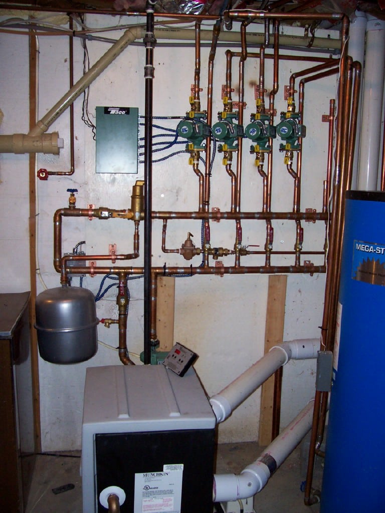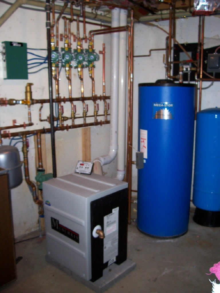 Munchkin condensing boiler with 5-zone pre-fabricated zoning board and Mega-Stor indirect-fired DHW tank.